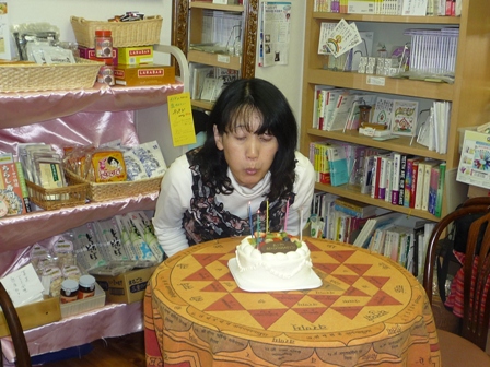 雨降りの中、お昼にケーキでスタッフの佳子さんのお誕生会(この前の続き)。